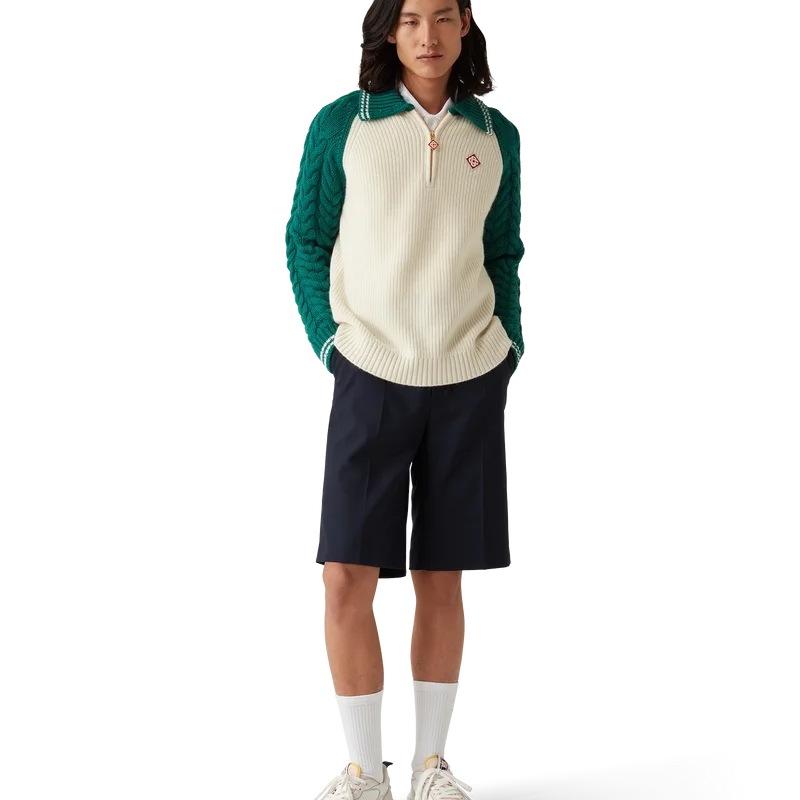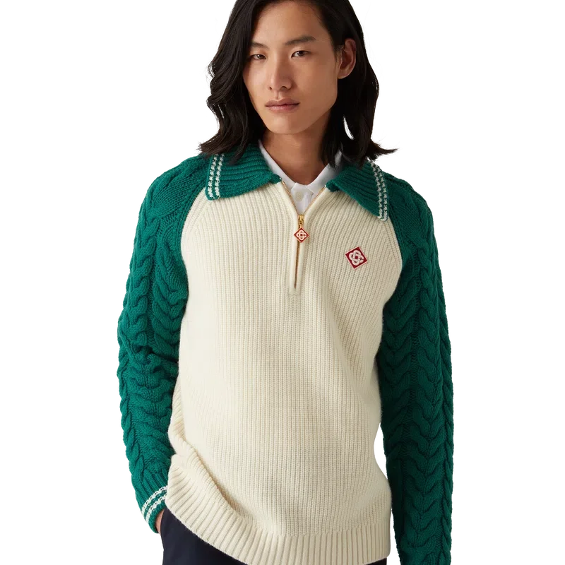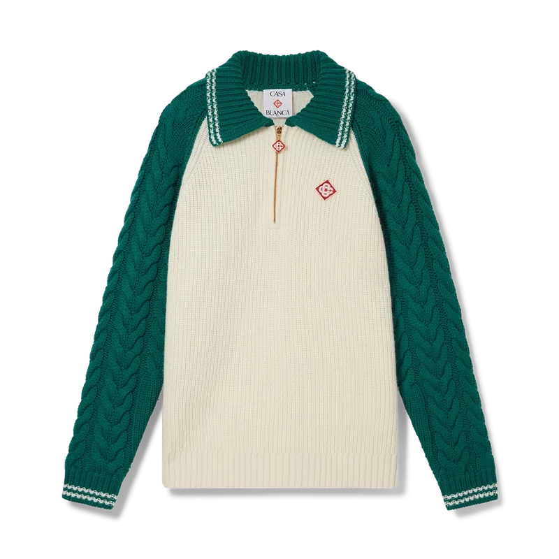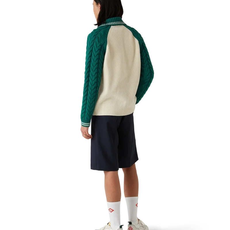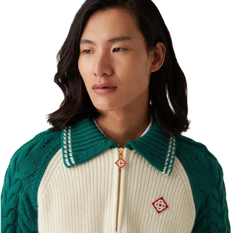 Kashmirtröjan med kabelstickning är en långärmad tröja med strukturerad design, tillverkad av ett kashmirblandat tyg. Den är försedd med husets signaturdiamantlogo, en kvartslång dragkedja, ribbad krage, muddar och nederkant, kontrasterande krage och raglanärmar med kabelstickning och vita randiga detaljer.