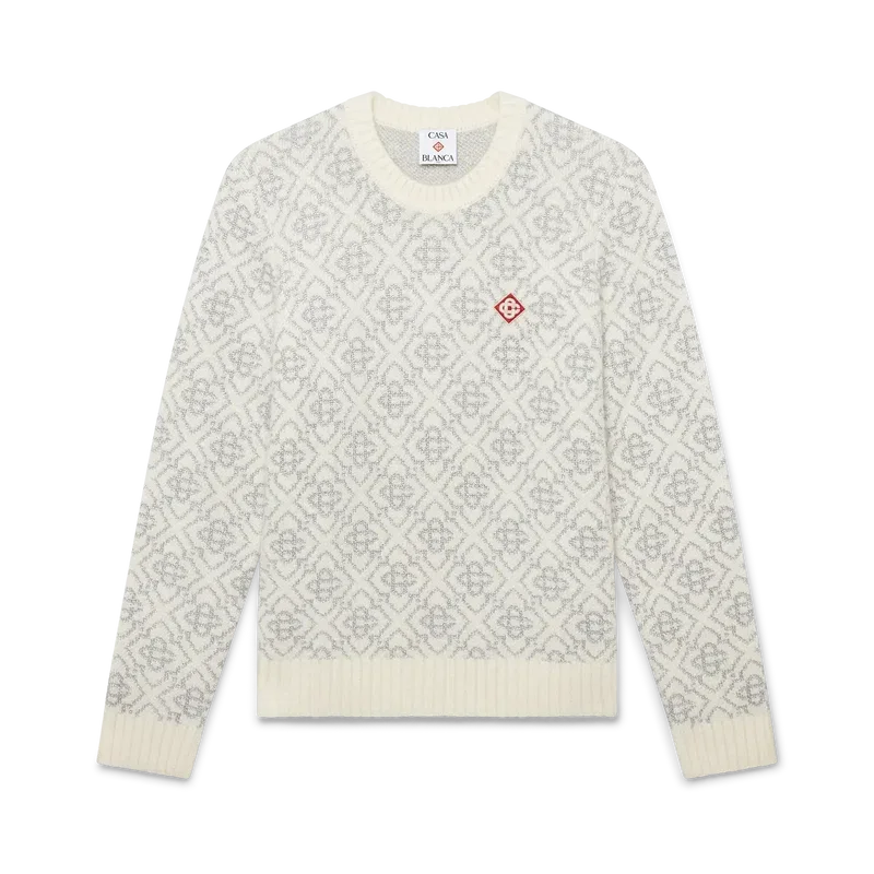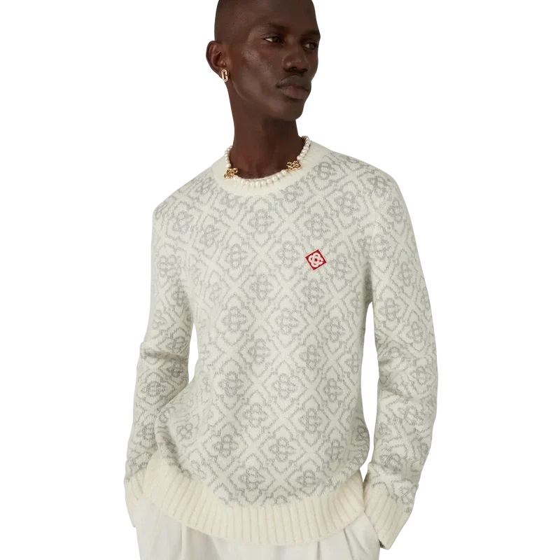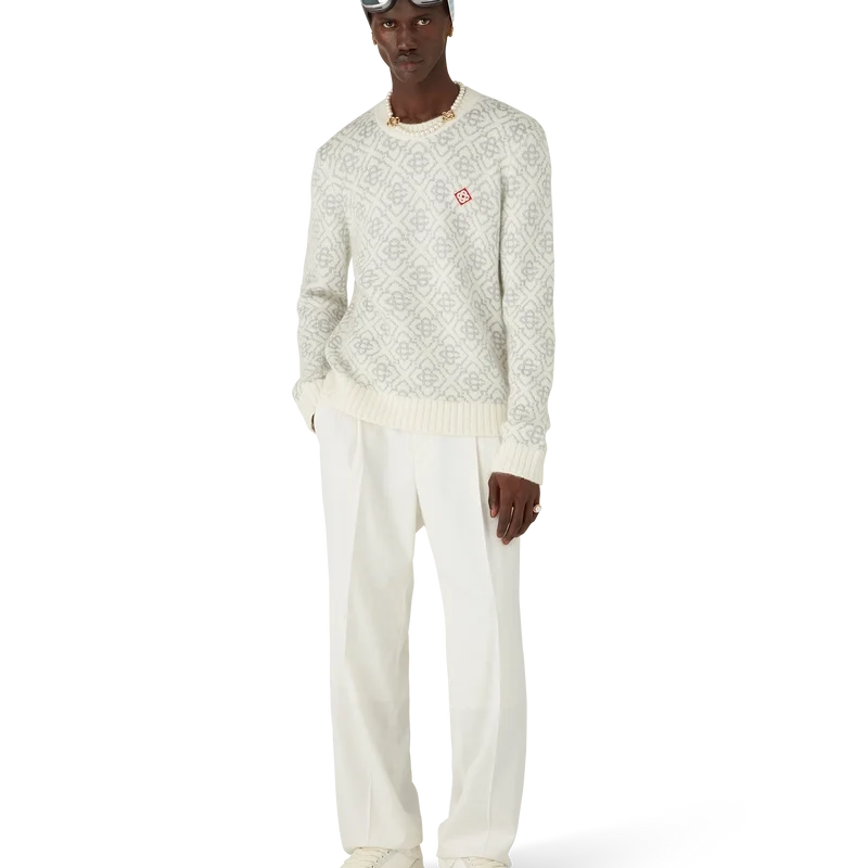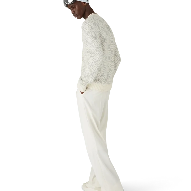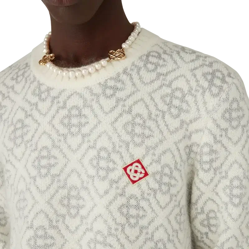 Ski Jumper är en raffinerad Apras-Sport-design i mohairtyg med husets vita och gråa monogrammotiv, inspirerad av frostmönster på traditionella japanska bondhusfönster. Designen hämtar inspiration från snökristaller på bambuskogar och kombinerar sportig elegans med alpin funktionalitet. Avslutas med ribbstickad rund hals och fåll.