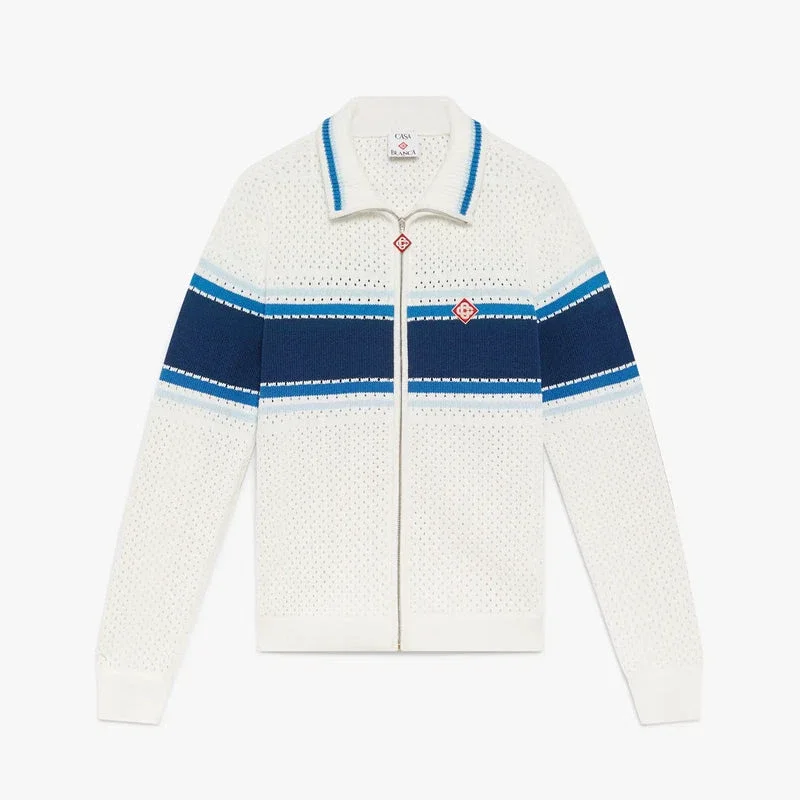 Den randiga mesh-träningsjackan har en raffinerad design med en blå rand över bröstet, ärmarna och ryggen. Kompletterad med dragkedja med märkets signaturdiamantlogotyp på dragkedjetappen, stickad krage, muddar och nederkant med blå randiga kantdetaljer samt sidfickor.