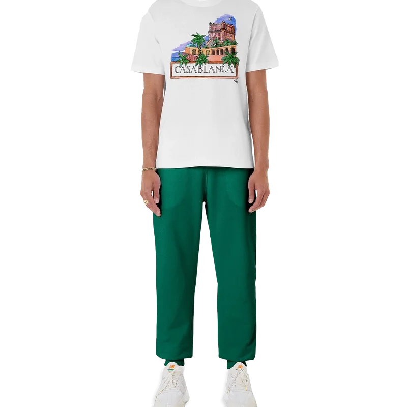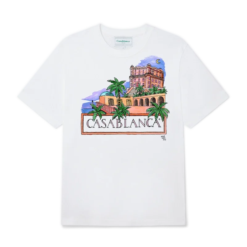 Amour Maroc-T-shirten i ekologisk bomull pryds av ett av varumärkets mest ikoniska konstverk, ”Maison”, som först lanserades 2019. Den har en klassisk rund hals, korta ärmar och en etikett med Casablanca Paris-logotypen, och är designad för en avslappnad passform.
