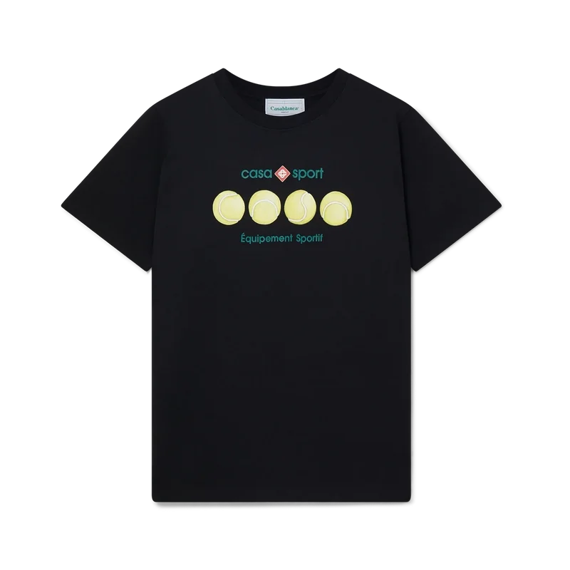 Casa Sport Tennis Balls-T-shirt i ekologisk bomull med screentryck har säsongens motiv som införlivar husets signaturtennis och Casa Sport-ikonografi. T-shirten har en klassisk rund hals, korta ärmar och Casablanca Paris-märkesetikett, och är designad för en avslappnad passform.