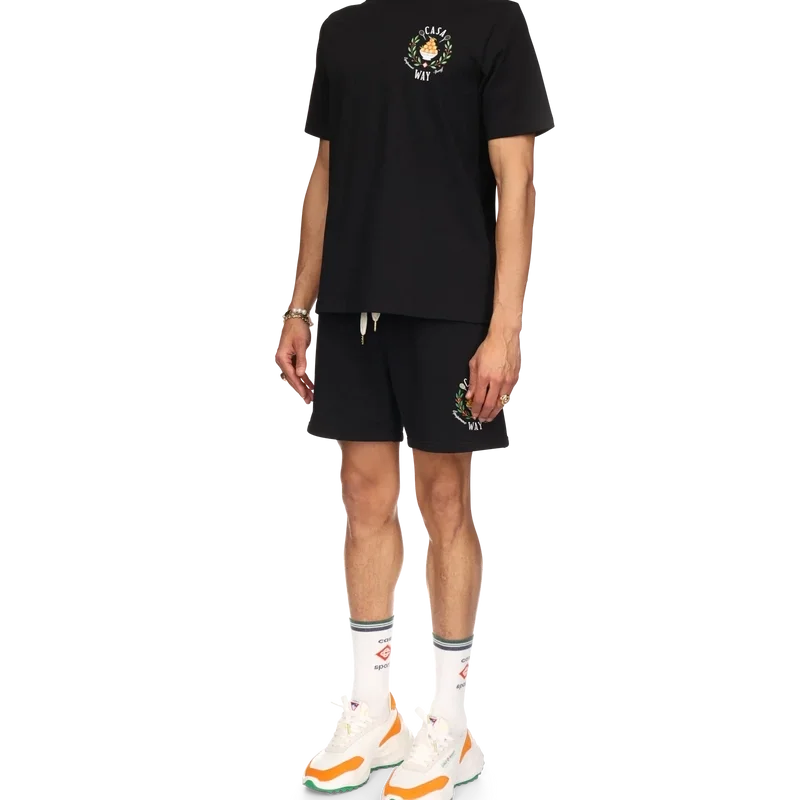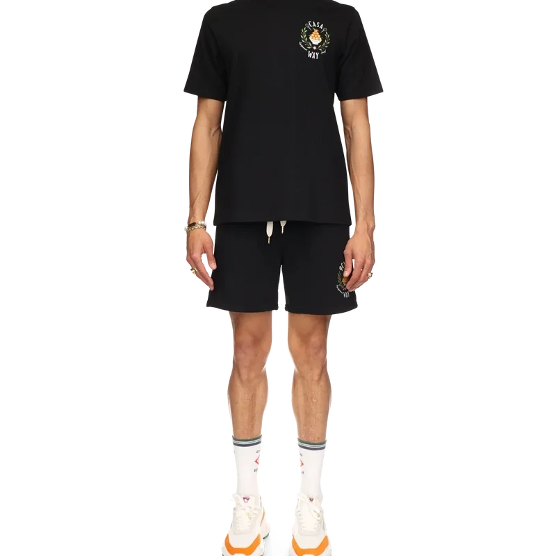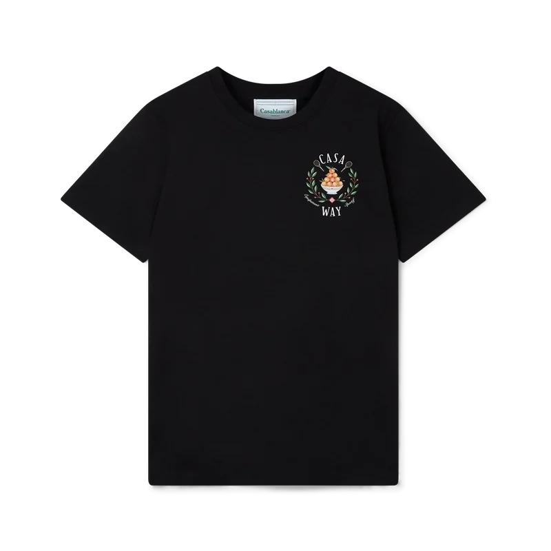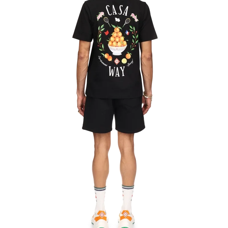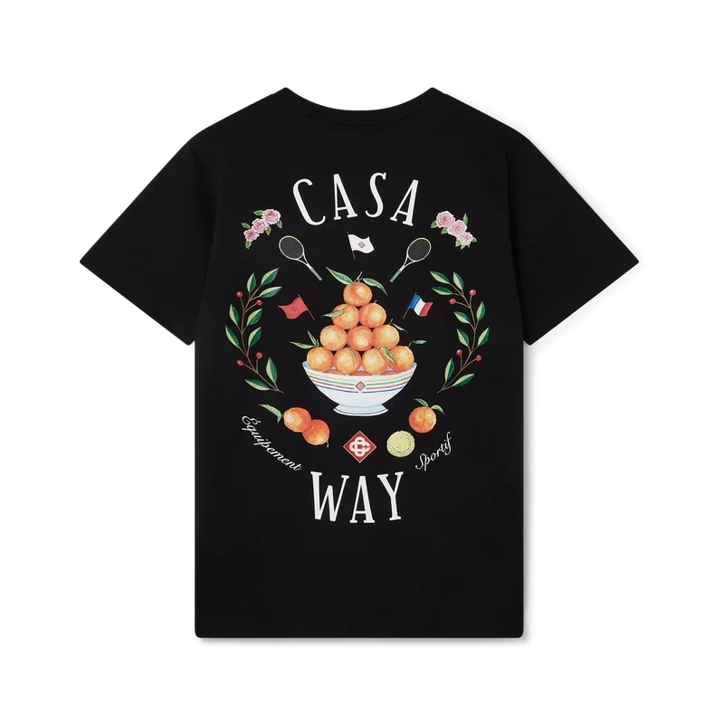 Casa Way T-shirten har ett tryck av husets klassiska ikonografiska konstverk med den orangea pyramiden, tennisracketerna och blommönstret som upprepas i ett större tryck på baksidan. Tillverkad av 100 % ekologisk bomull och kompletterad med en klassisk rund halsringning och Casablanca-märkesetikett.