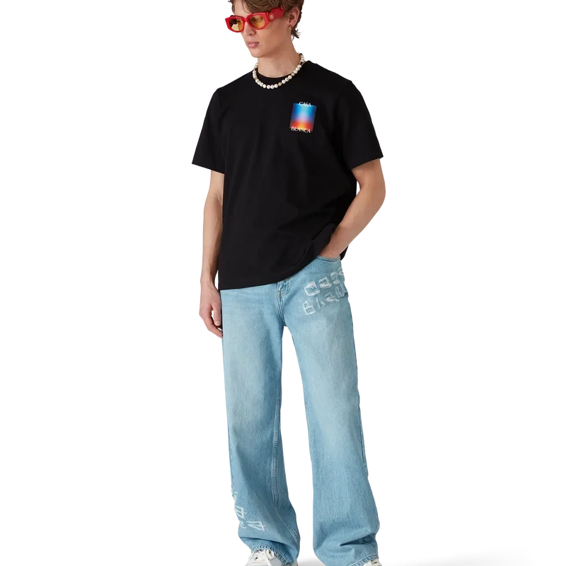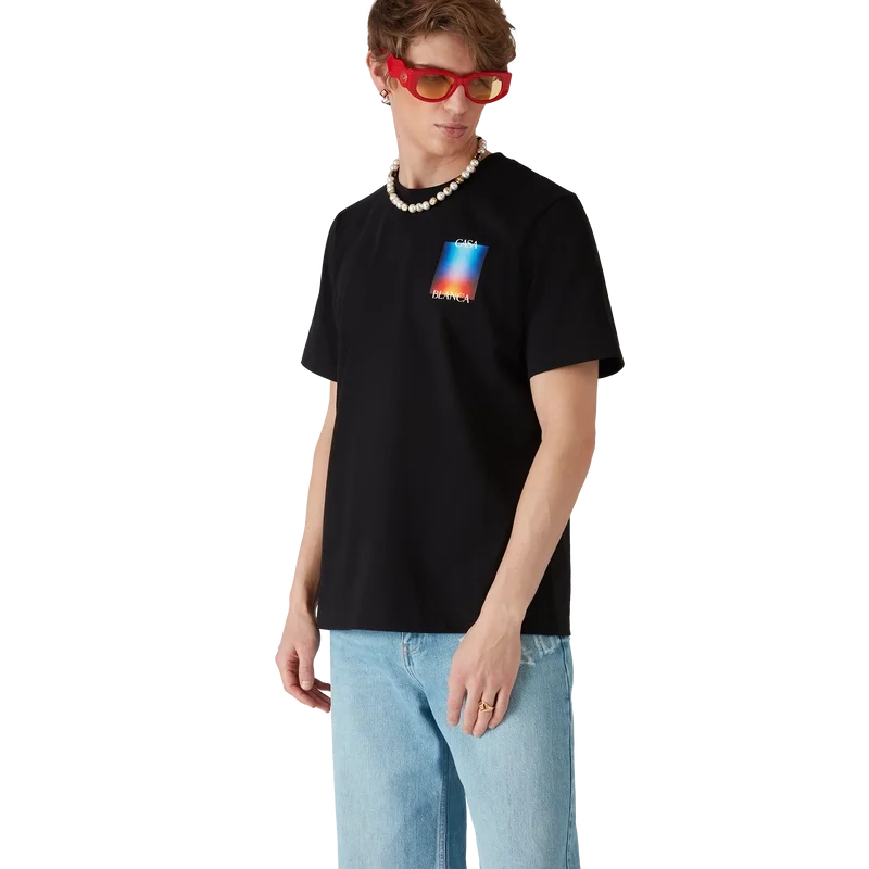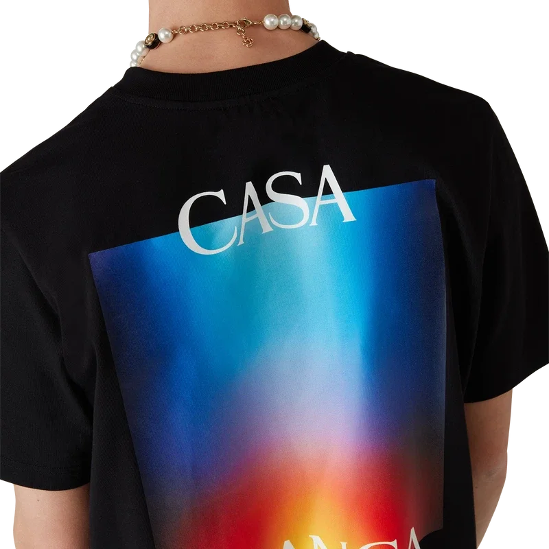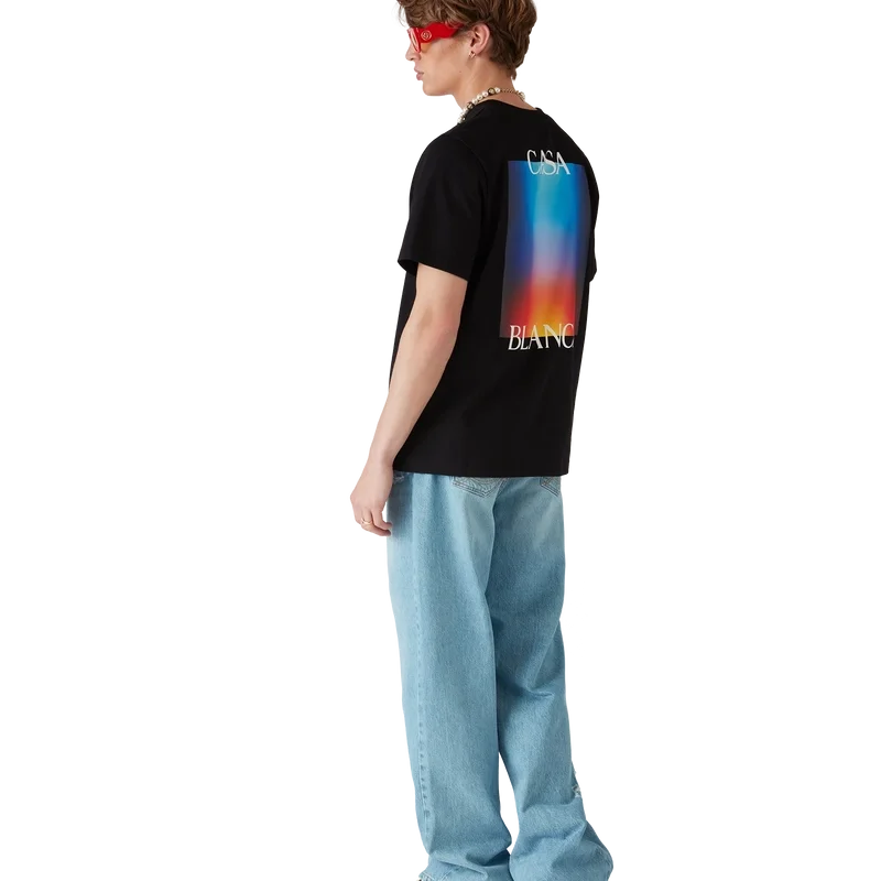 Gradient Casa Logo T-shirt är en kortärmad tryckt design tillverkad av ekologiskt bomullstyg med husets säsongsbetonade gradient inspirerad av en futuristisk tolkning av Casablanca-gradienten: en halo-form inspirerad av vintage sci-fi-affischer och skivor. Avslutas med en klassisk rund hals.