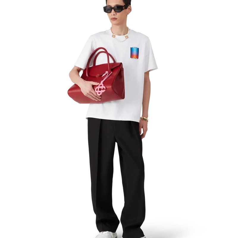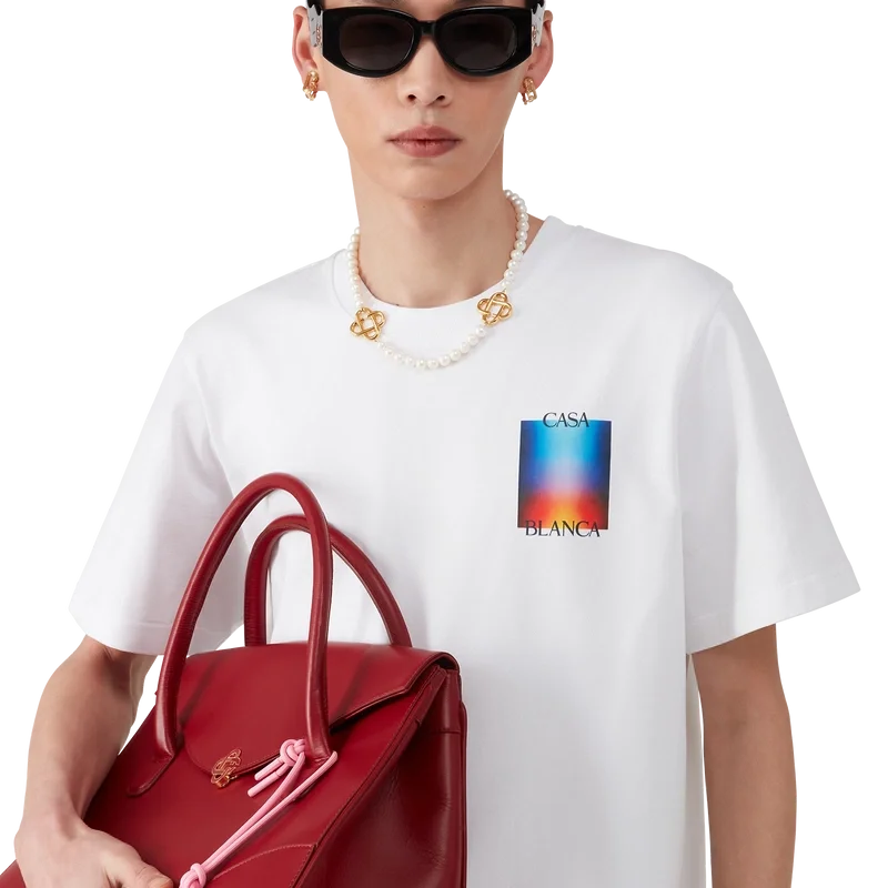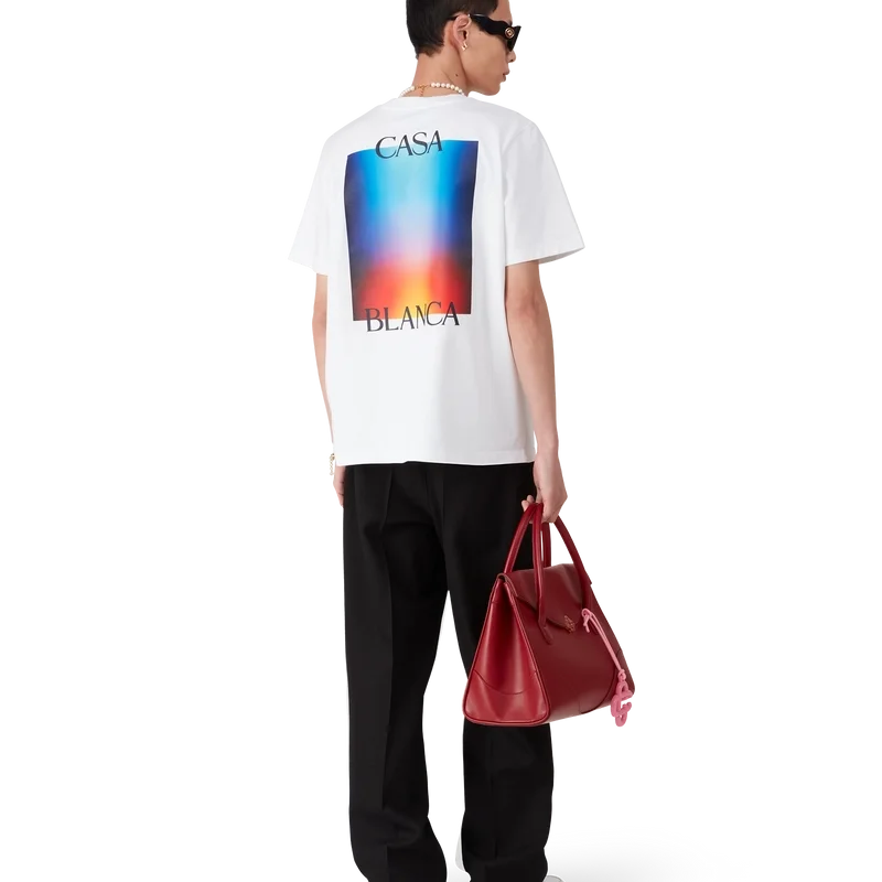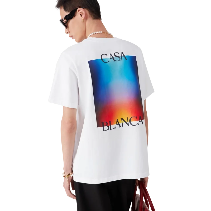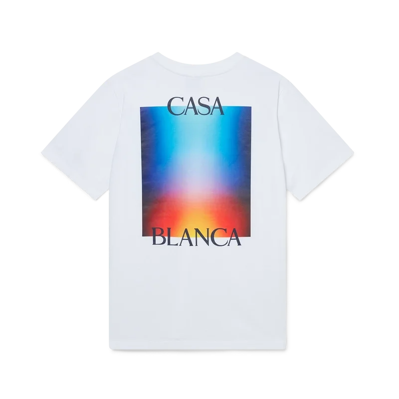 Gradient Casa Logo T-shirt är en kortärmad T-shirt med tryck, tillverkad av ekologisk bomull. Den har husets säsongsbetonade gradient, inspirerad av en futuristisk tolkning av Casablanca-gradienten: en haloform inspirerad av vintage-affischer och skivor från science fiction-genren. Avslutas med en klassisk rund hals.