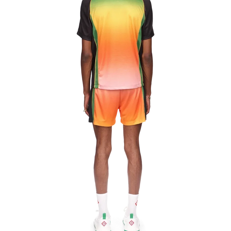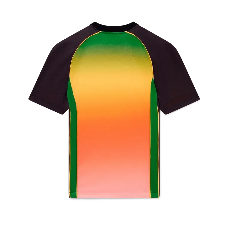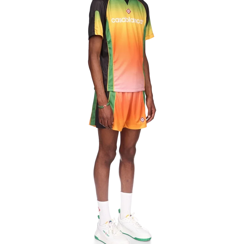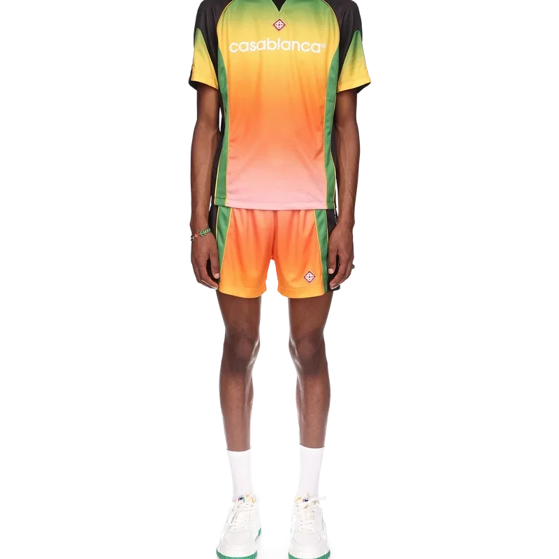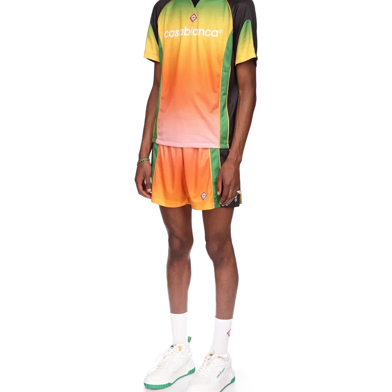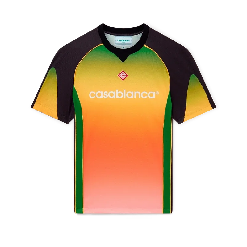 Gradient fotbollskjortan är en kortärmad sportkjol med en färgskala som representerar det rika utbytet mellan olika kulturella discipliner inom afrikansk konst, musik och film. Tillverkad i Birdseye Mesh och kompletterad med husets signaturdiamantlogotyp och Casablanca-logotypen över bröstet samt en klassisk rund hals.