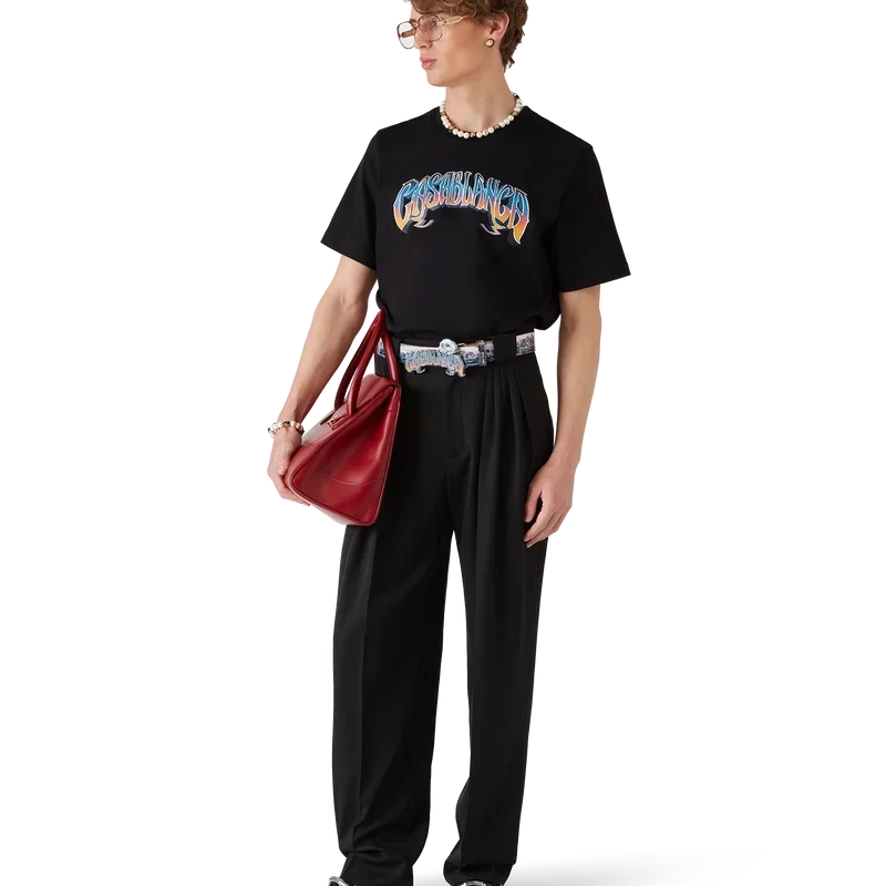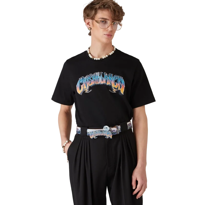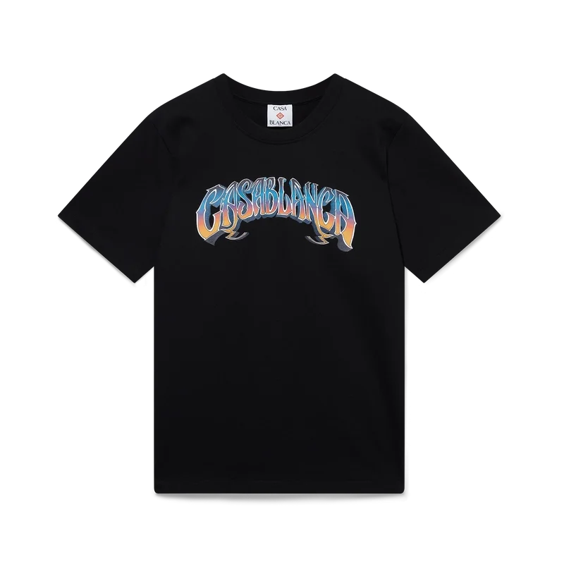 Gradient Gothic T-shirt är en kortärmad T-shirt med tryck, tillverkad av ekologisk bomull. Den har en handritad typografi av Casablanca-logotypen med säsongens gradient, inspirerad av den gotiska typsnittet som används i tatueringar. Avslutad med en klassisk rund hals.