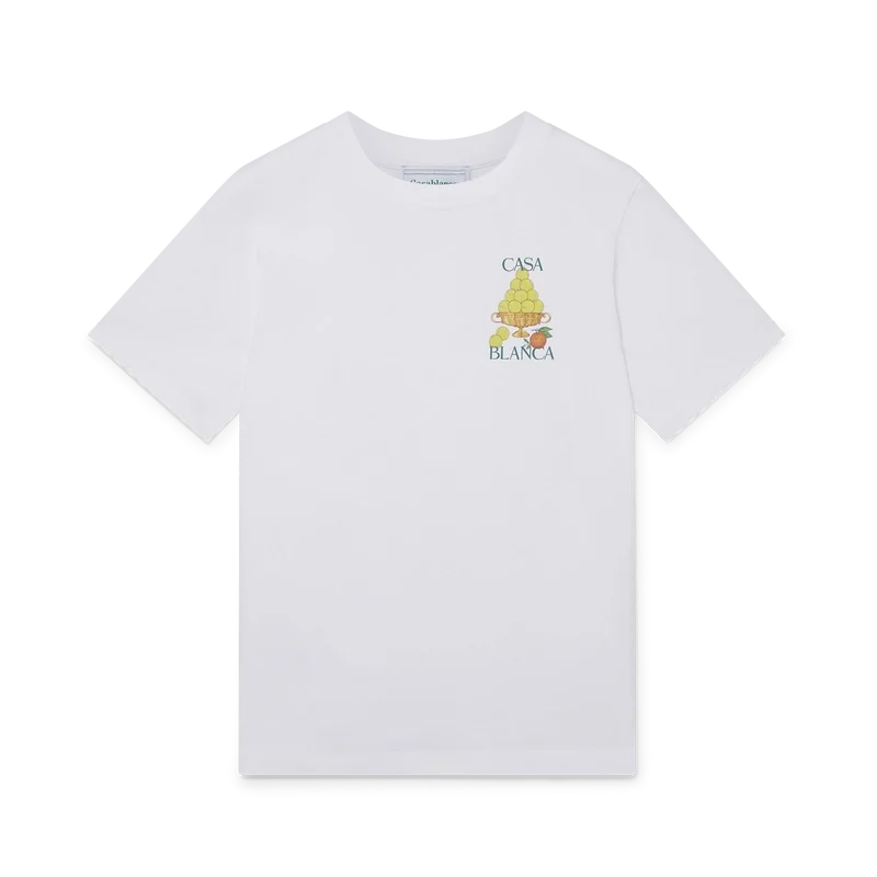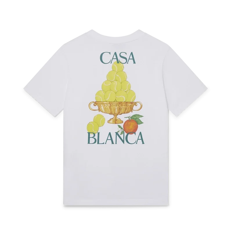 Le Triomphe De Tennis T-shirt är en kortärmad T-shirt med tryck, tillverkad av ekologisk bomull och prydd med husets ikoniska orangea pyramidmotiv, omtolkat för denna säsong. Den har en klassisk rund halsringning och Casablanca-logotyp.