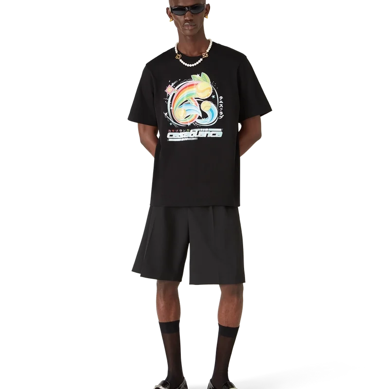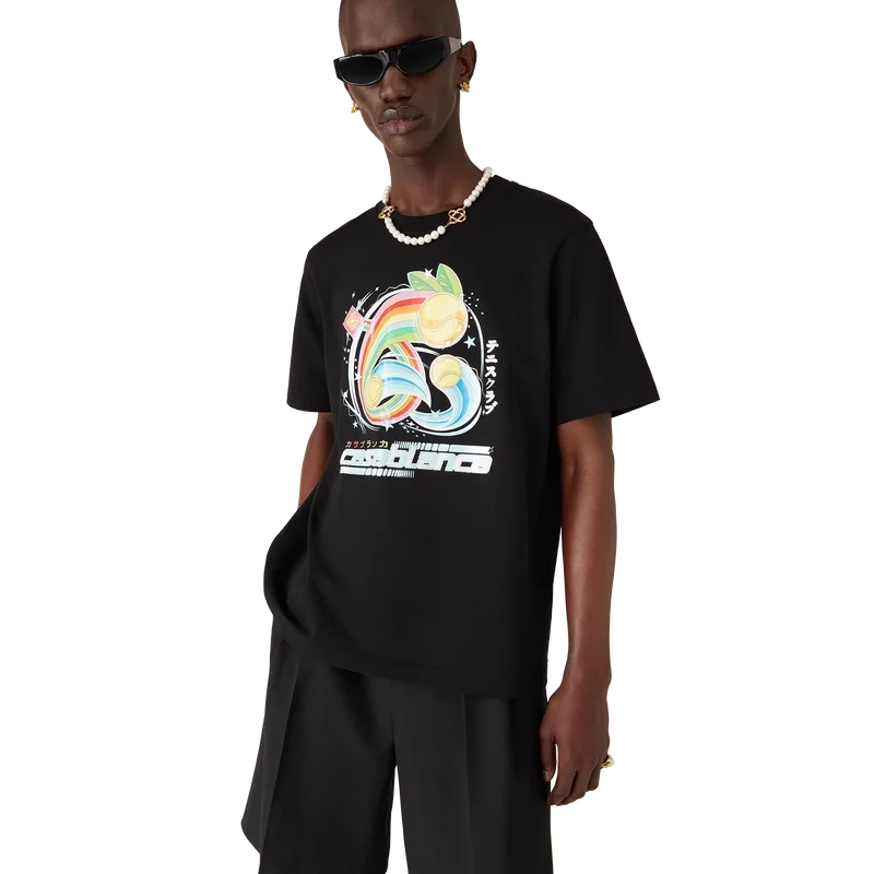 Manga Tennis Ball T-shirt är en kortärmad modell tillverkad av ekologiskt bomullstyg med säsongsbetonat tryck som fortsätter att utforska världen av kawaii och manga, leker med Casablancas ikonografi och använder tennisbollar som apelsiner för en rolig twist. Avslutas med en klassisk rund hals.