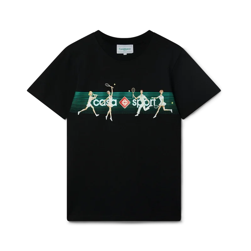 T-shirten Playful Stripes i ekologisk bomull med screentryck har säsongens motiv som kombinerar husets signaturikonografi inom tennis och Casa Sport. Kompletterad med klassisk rund hals, korta ärmar och Casablanca Paris-märkesetikett, designad för en avslappnad passform.