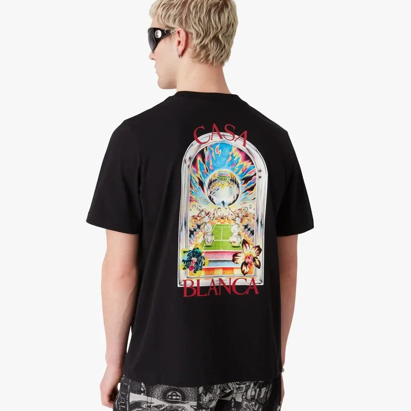 Den svarta kortärmade T-shirten Tennis Landscape har en raffinerad design med ett motiv där sammanlänkade ramar skapar nischer med olika scener som beskriver transcendens av tid och plats genom sportens fokus. Avslutas med en klassisk rund halsringning.