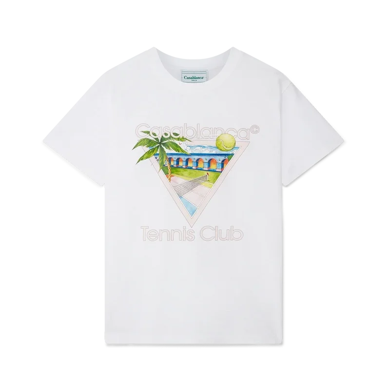 Tennis Club Icon T-shirt är en screentryckt design med husets signaturmotiv, omtolkat för denna säsong med inslag av tennis, natur och arkitektur. Tillverkad i vit jersey och avslutad med en klassisk rund hals och en Casablanca-märkesetikett.