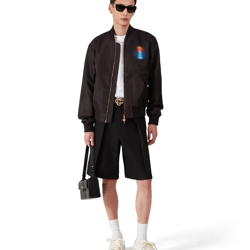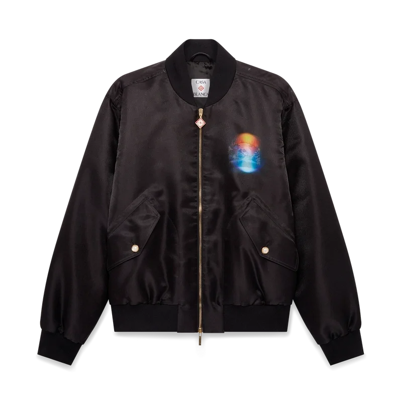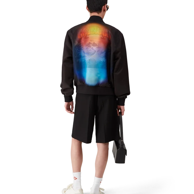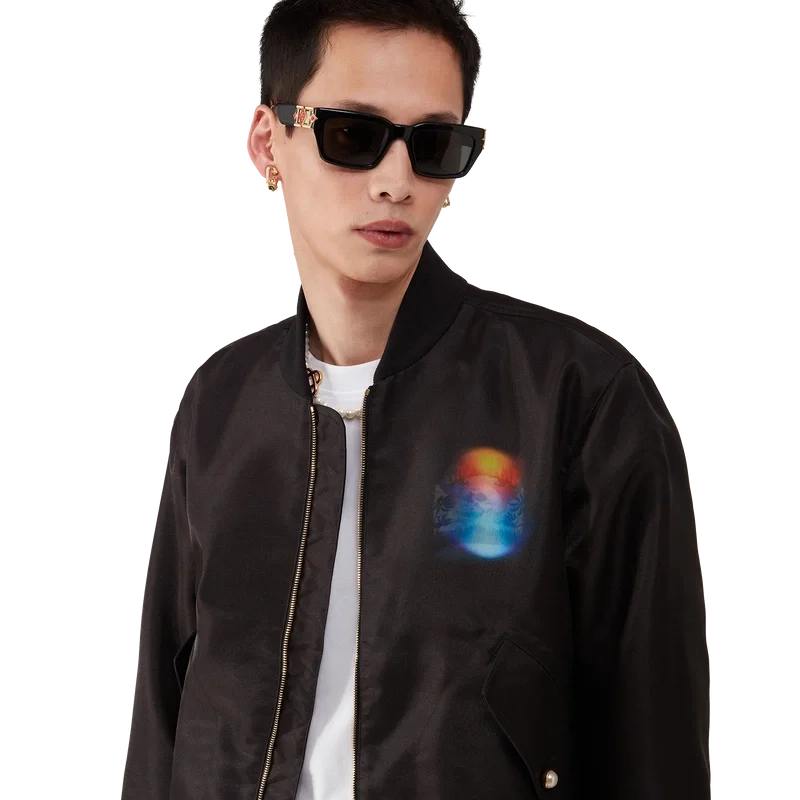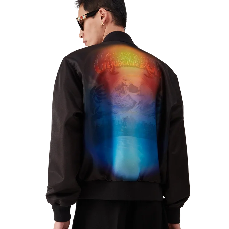 Organza-bomberjackan med gradient är en klassisk silhuett tillverkad av organza-tyg med säsongens gradient och La Pramonitions konstverk av en kuslig vision av La:s silhuett på natten, med UFO-element som anspelar på vintage-sci-fi-inspiration – på bröstet och ryggen. Kompletterad med dragkedja, framfickor med lock och signaturknappar med guldkant och pärlor, samt stående ribbad krage, muddar och nederkant.