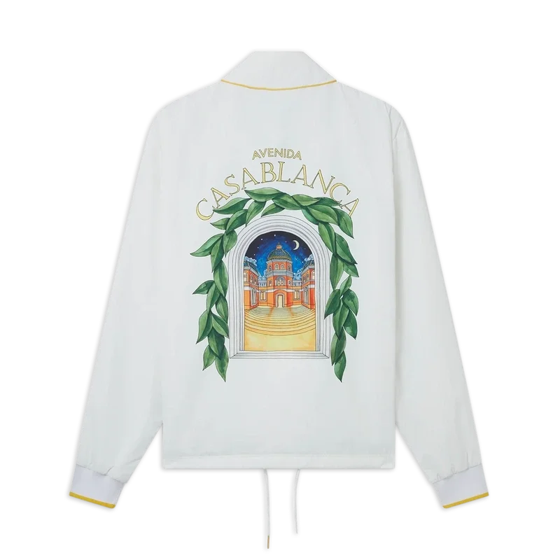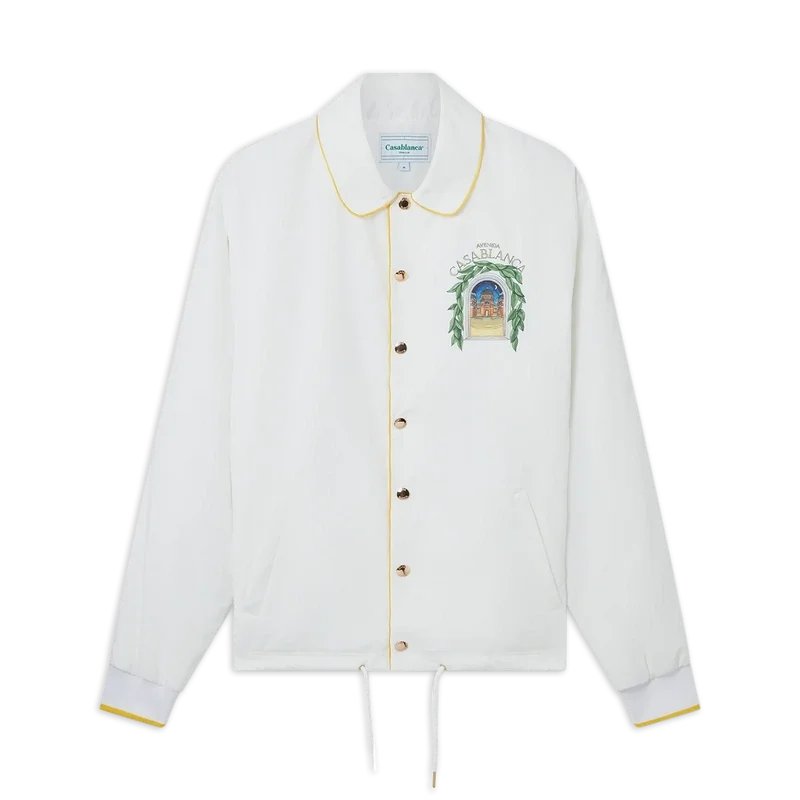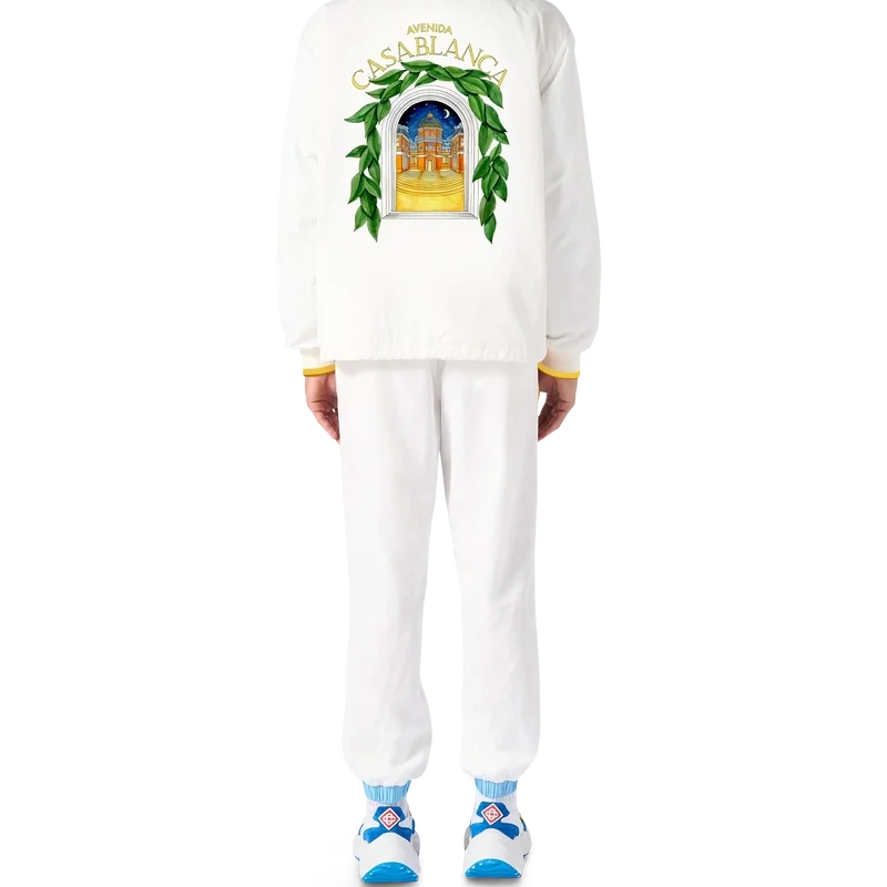 Casablanca Avenida Coach Jacket i vitt har ett viktigt säsongsmönster där naturens fria flöde möter strukturen i det konstgjorda designen – bågen, en abstrakt symbol för styrka. Avslutad med gul ribb, dragskor och knäppning med knappar.