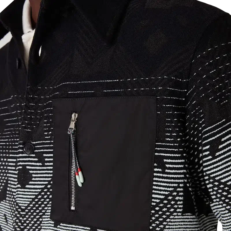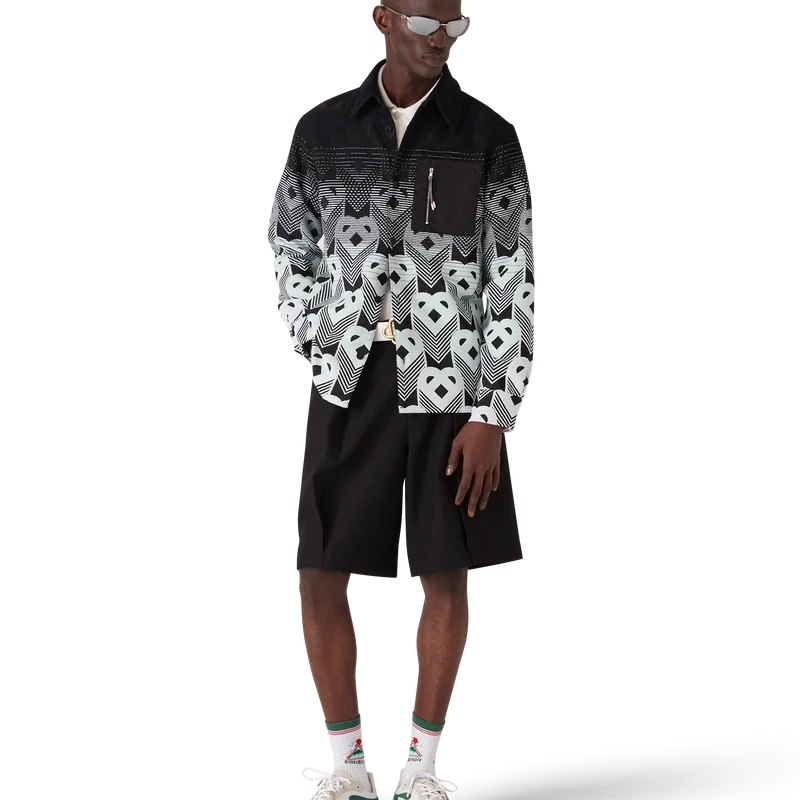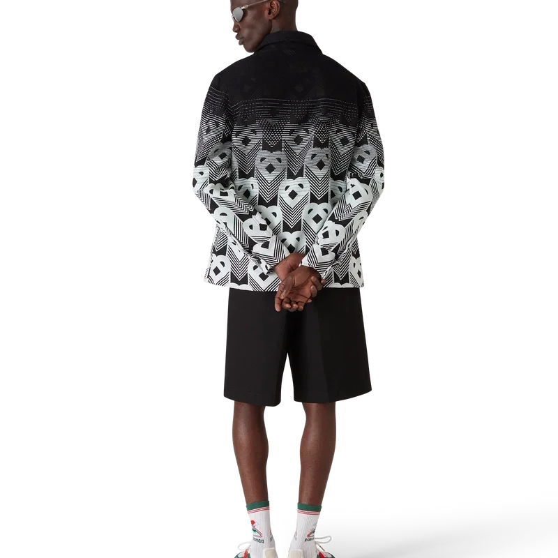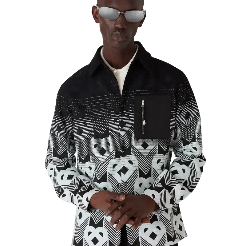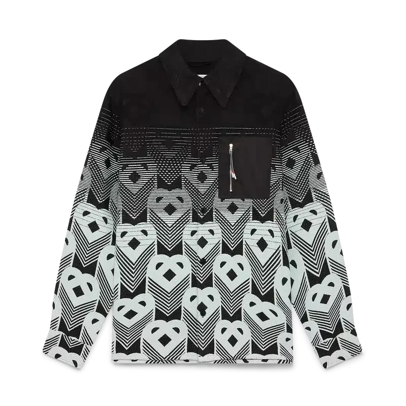 Monogram Gradient Shacket är en långärmad modell tillverkad av ett jacquardbouclé-tyg. Den har krage, bröstficka, knäppning och guldpläterade knappar med märkeslogotyp.