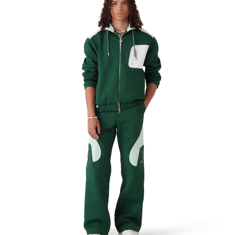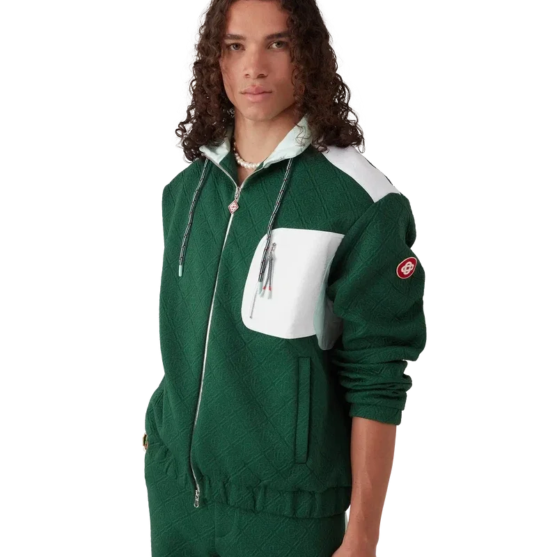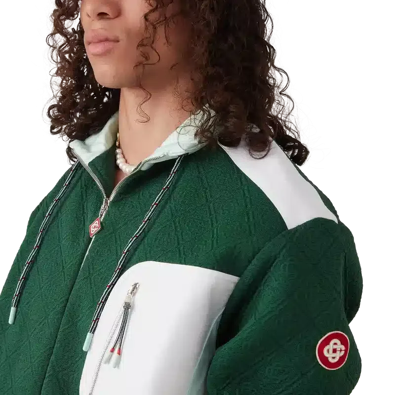 Nylonjackan med monogram i jacquard är en långärmad modell tillverkad i jacquardstickat tyg. Den har en hög krage med dragsko, dragkedja, vertikala fickor och en kontrasterande bröstficka med dragkedja, elastiska muddar och nederkant, armbågsförstärkningar, husets CC-logotyp på ärmen, ventilationshål under armarna och meshfoder.