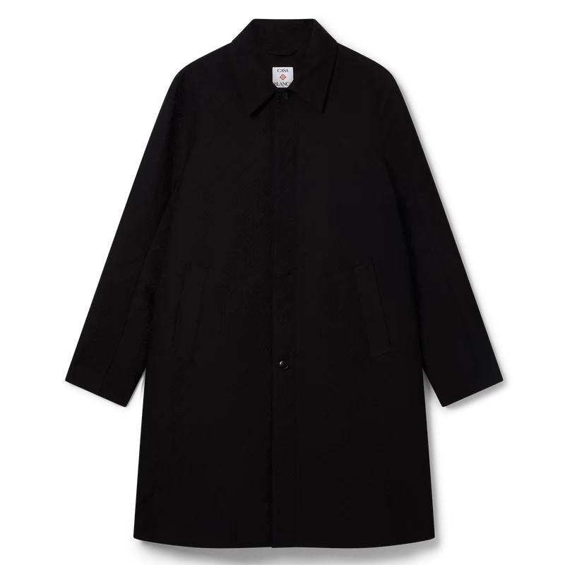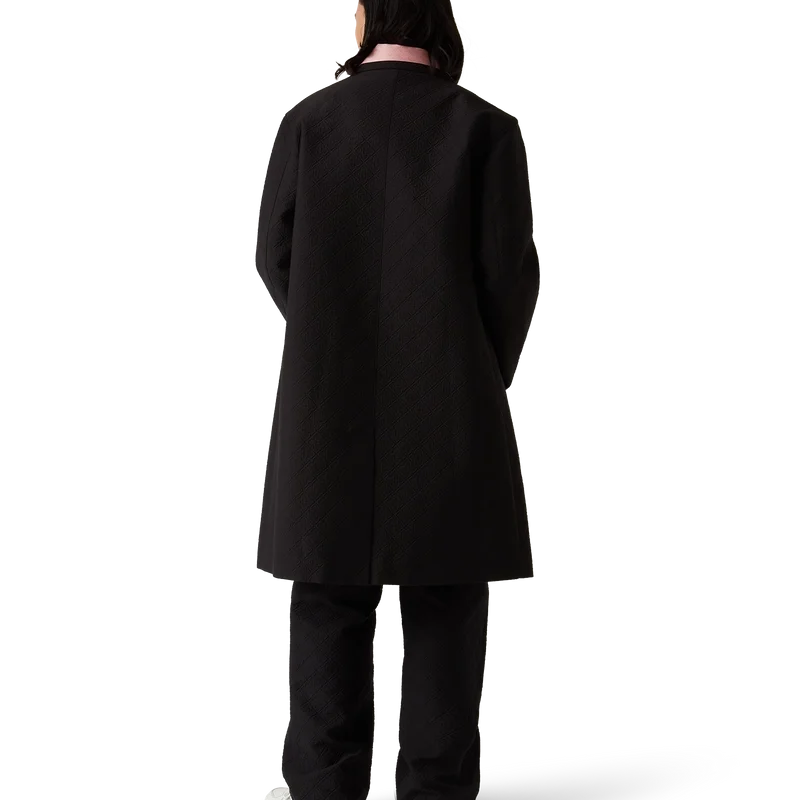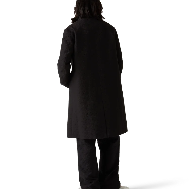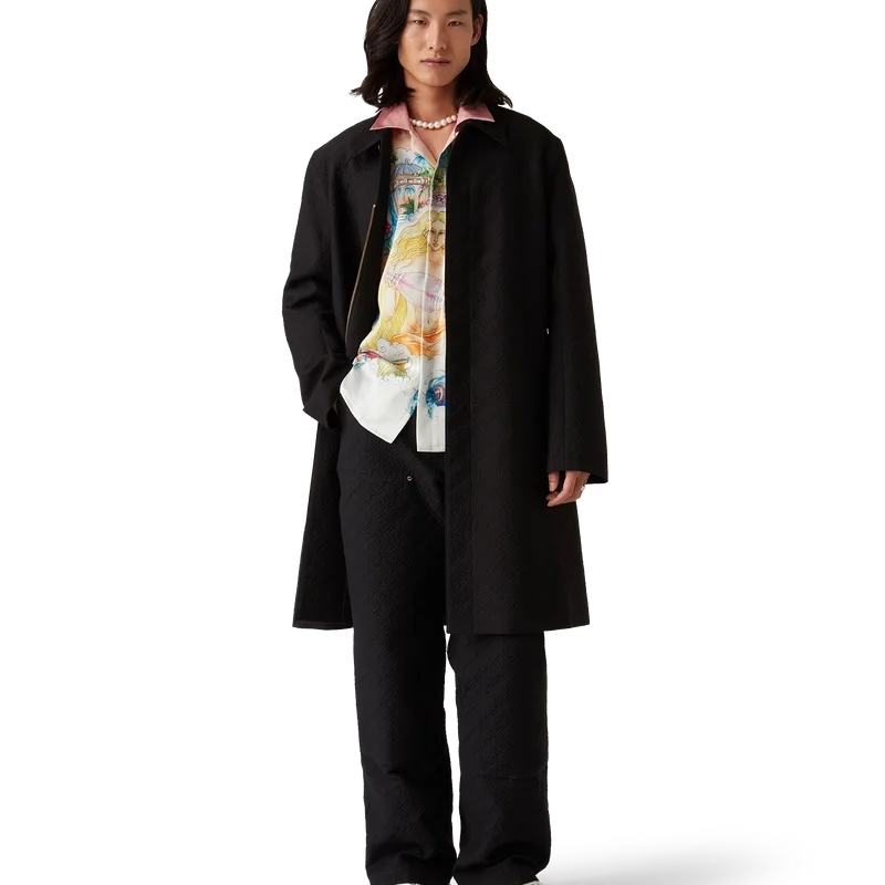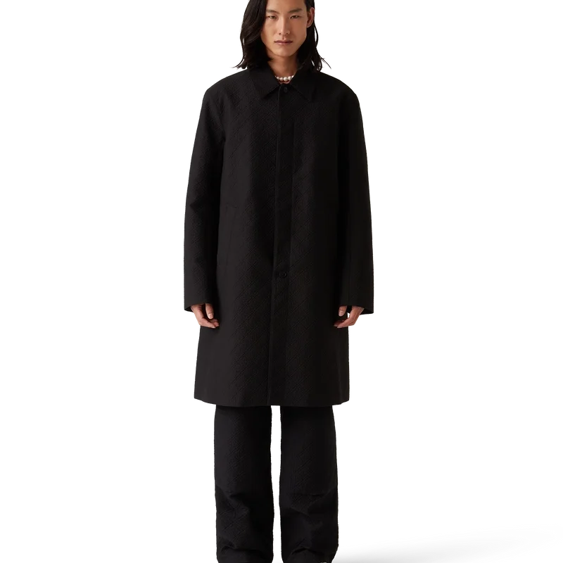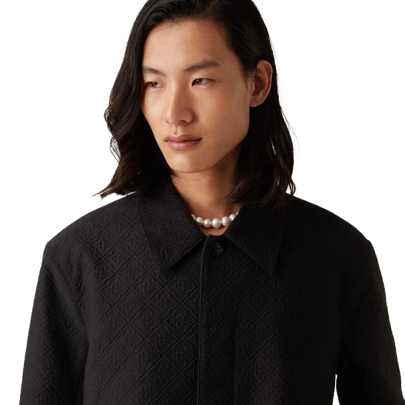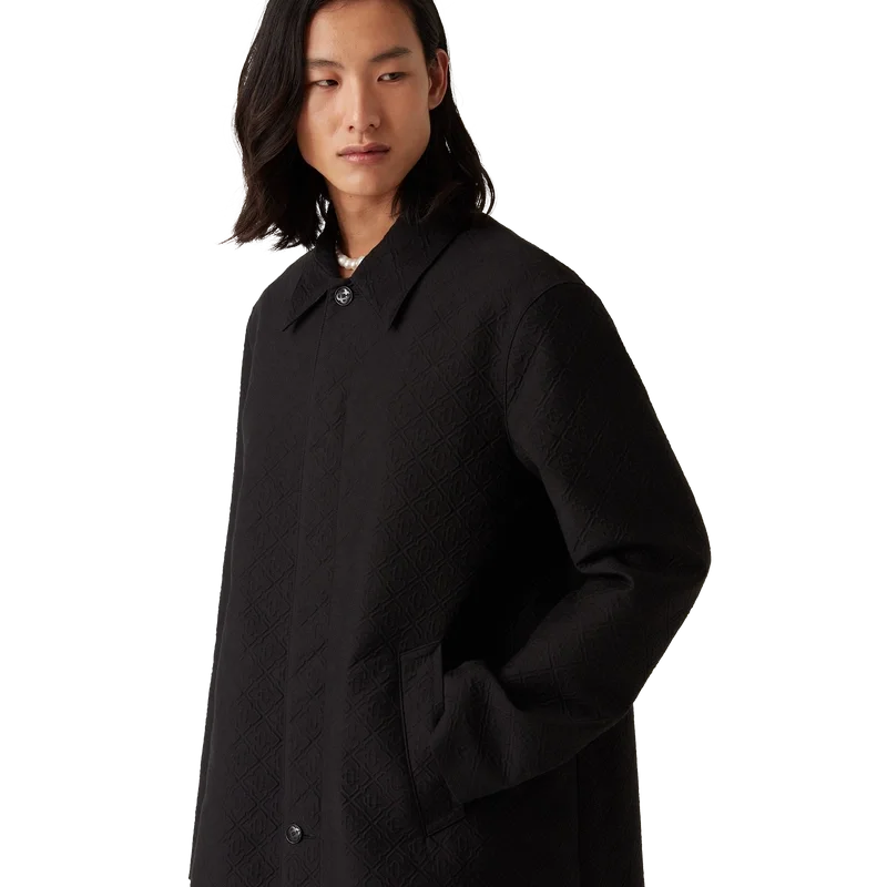 Jacquard-bilrocken är en medellång rock tillverkad av ett jacquardtyg i bomullsblandning, med husets Diamond Monogram. Den har knäppning fram, guldpläterade tryckknappar med märkeslogotyp, foder, trattkrage, vertikala sidfickor och en slits bak.