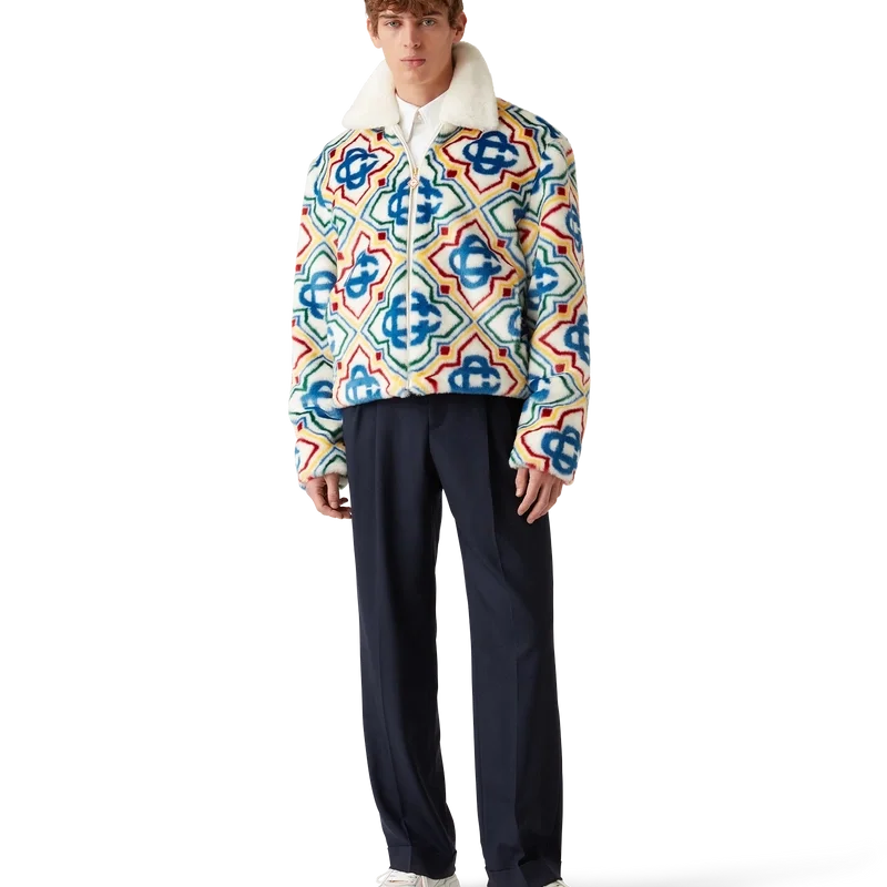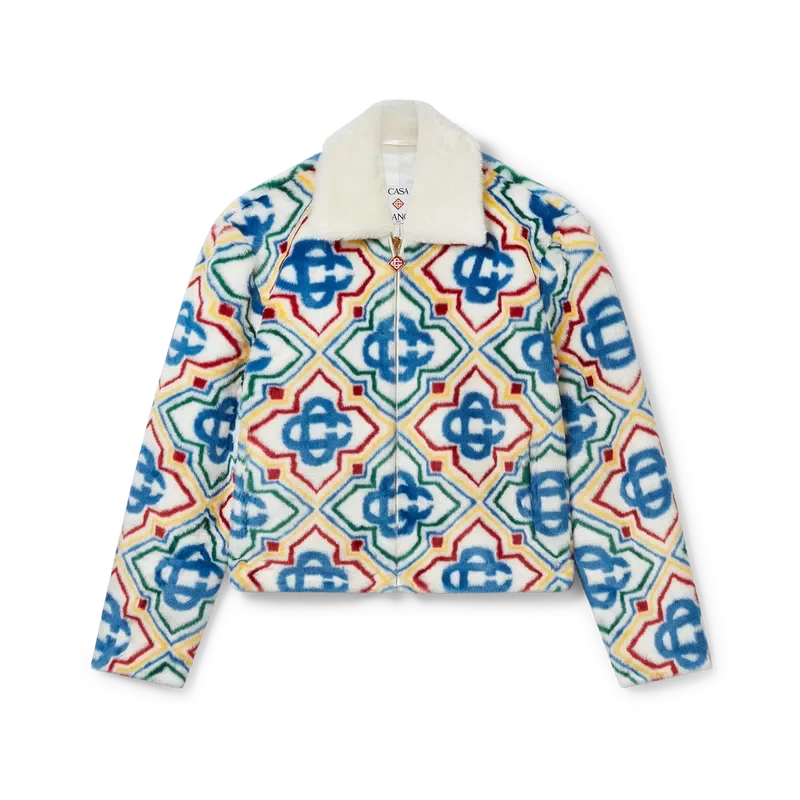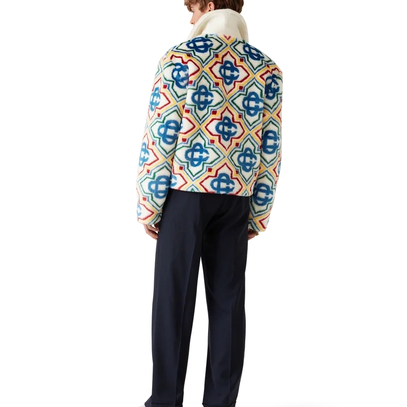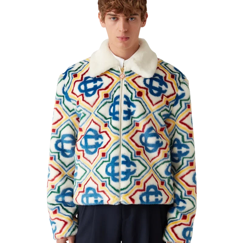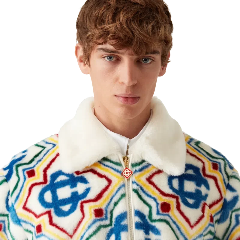 Jacquard-jackan i fuskpäls är en lyxig modell med mjuk struktur, tillverkad i ett jacquardtyg i fuskpäls med husets Diamond Monogram-logotyp. Den har dragkedja fram, sidofickor i sömmarna, foder och en uppvikt krage i lammnappa.
