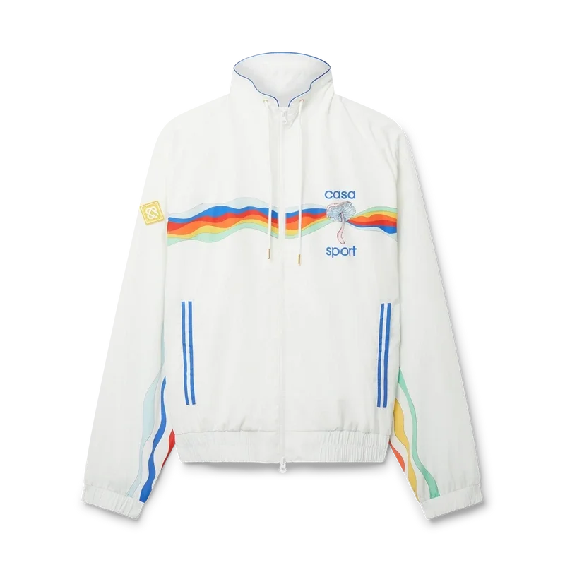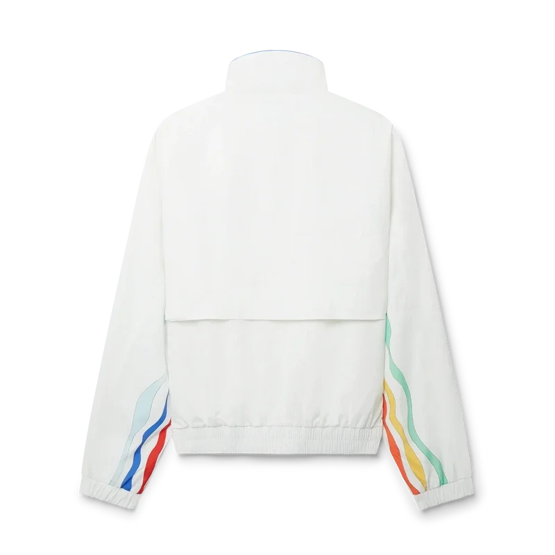 Sports Luxe får en retro-känsla med vår vita Mind Vibrations Wave Shell-träningsjacka i polyester. Den sportiga ytterplagets stil kombinerar vårt Mind Vibrations-motiv, ett centralt tema för vår/sommar 2023, med en klassisk träningsjacka-silhuett, dragkedja fram, sidfickor och dragskor med gulddetaljer. Här är den stylad med matchande träningsshorts.