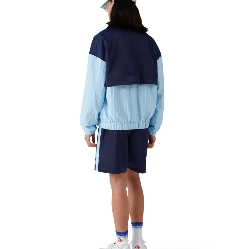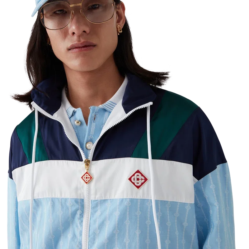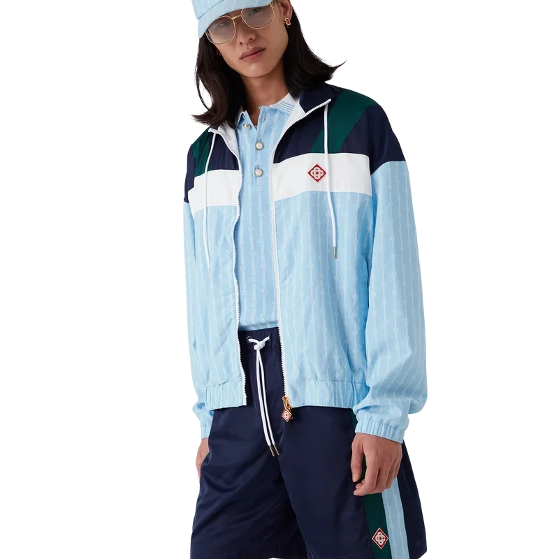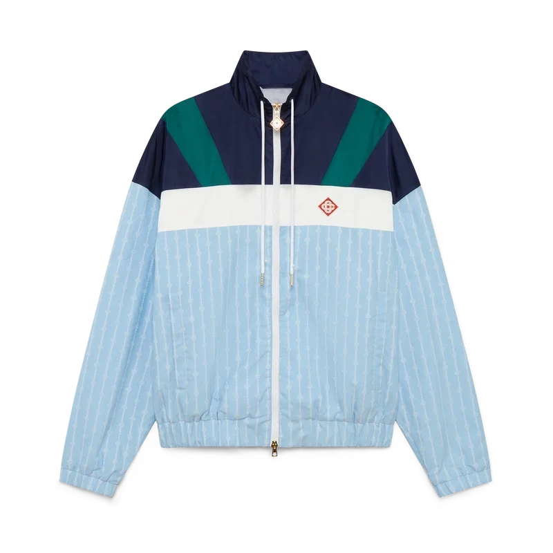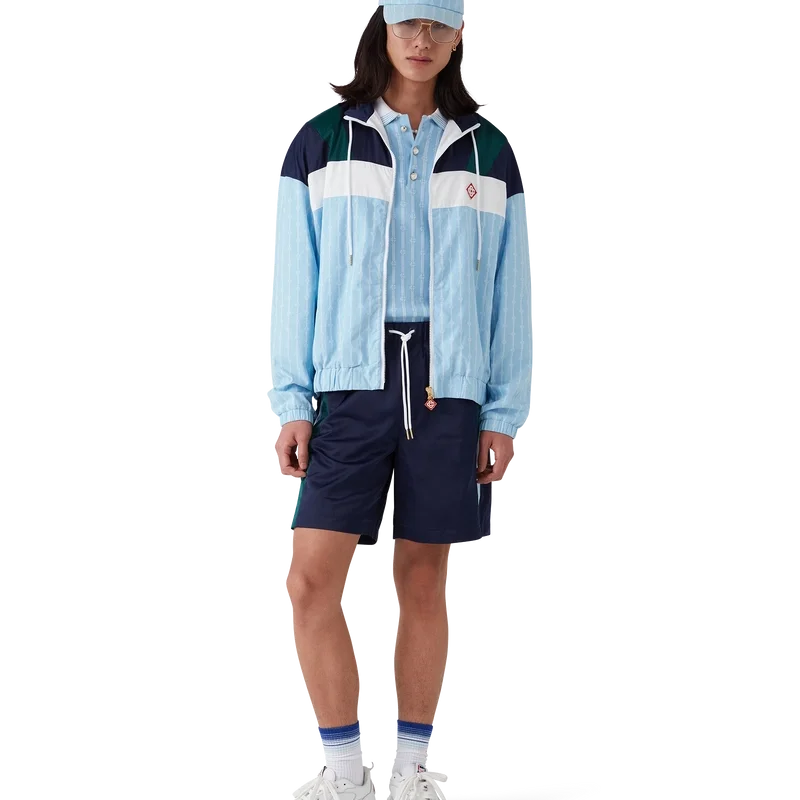 Den randiga nylonjackan är en sportklädsel designad i ett tekniskt tyg med husets signaturdiamantlogo. Komplett med dragkedja, marinblå, gröna och vita paneler på axlarna och bröstet, en polokrage med dragsko, vertikala fickor, regnskydd och ventilationspanel samt elastisk nederkant och manschetter.