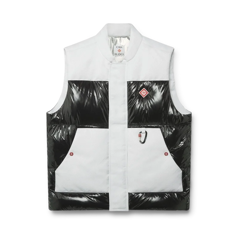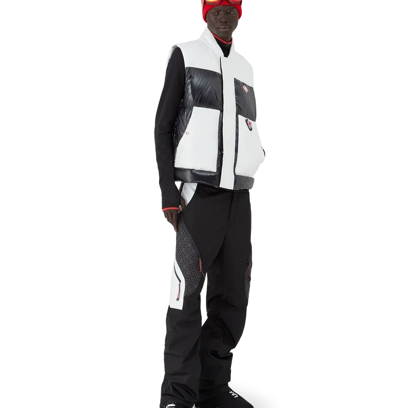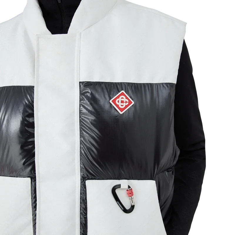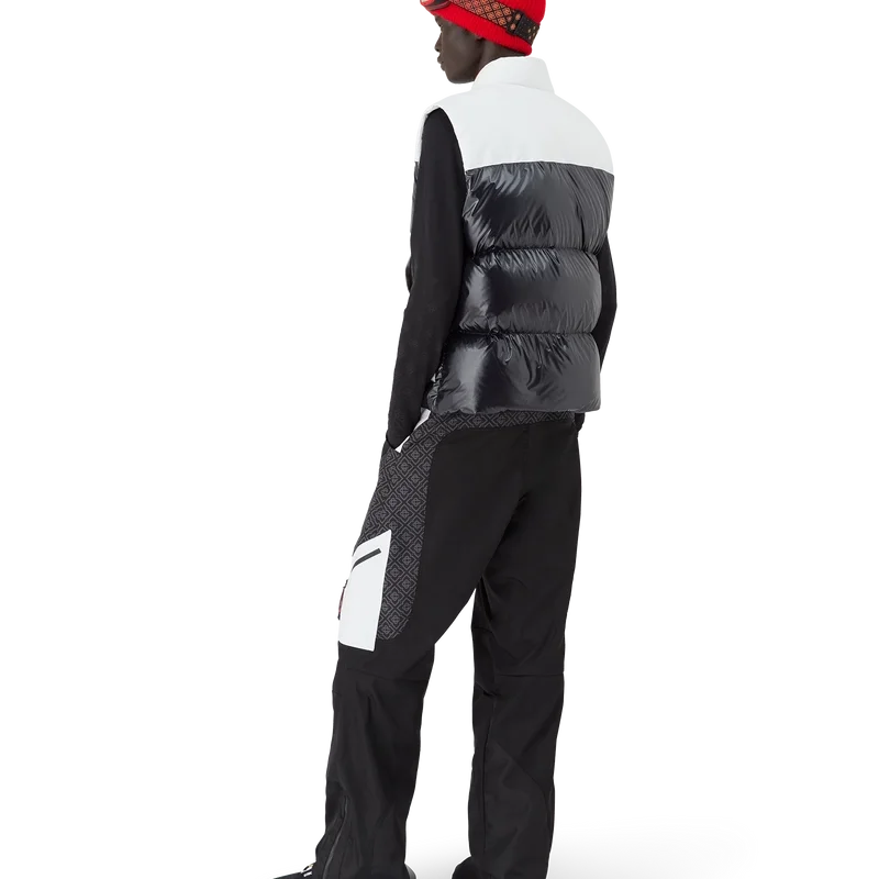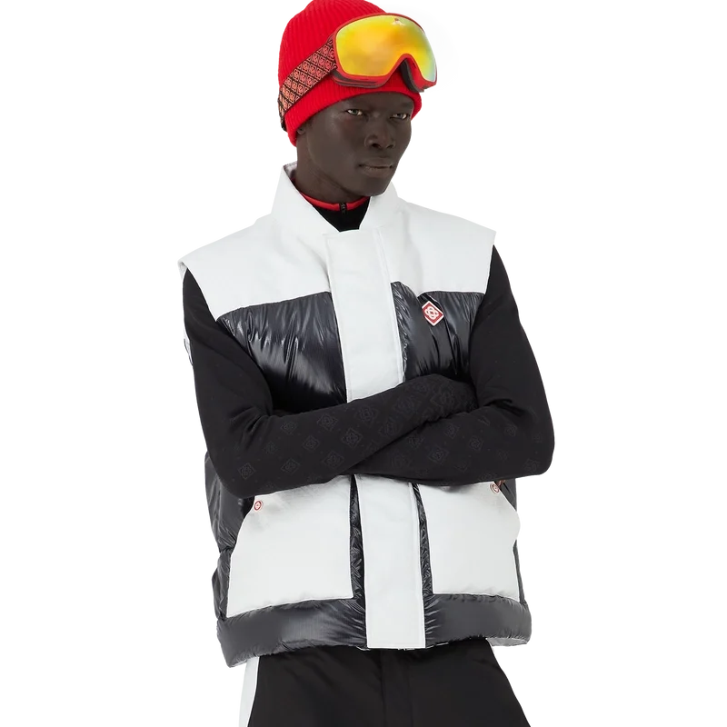 Ripstop Down Ski Vest är en raffinerad ytterplaggdesign tillverkad av Cc Ripstop och kontrasterande svart dun- och fjäderfyllning. Inspirerad av Japans bergiga landsbygd där gamla tempel dyker upp ur djupa snödrivor. Hämtar inspiration från det dramatiska samspelet mellan mörka träkonstruktioner mot strålande vita landskap och kala vinterträd som ramar in frusna vattenfall. Svart/Vit