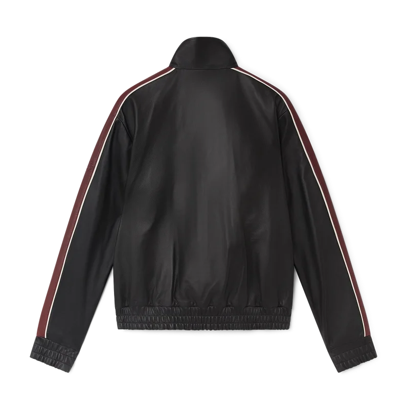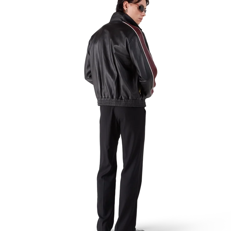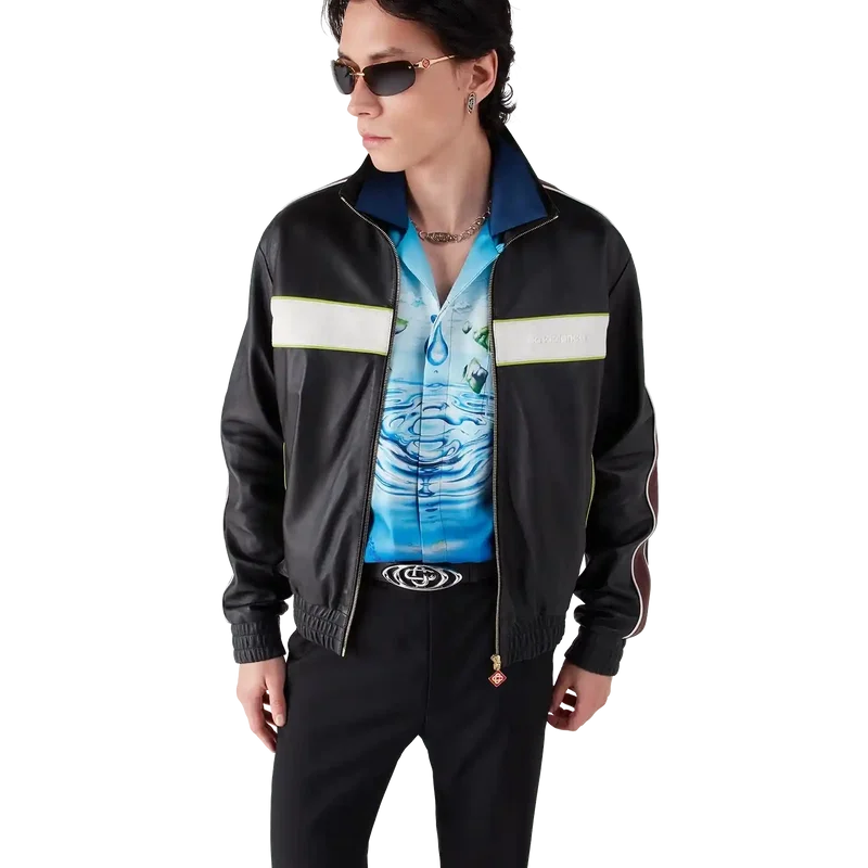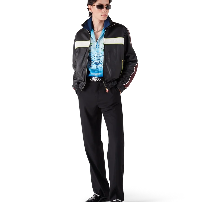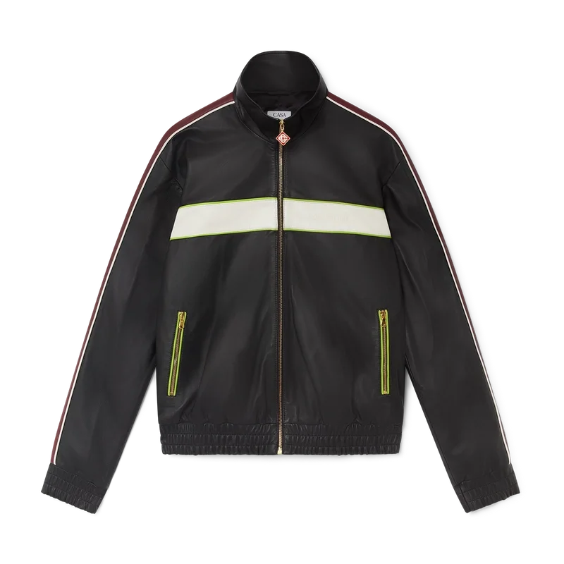 Den svarta läderjackan har en raffinerad design tillverkad av mjukt lammnappaläder, med husets signatur Casablanca-logotyp på bröstet. Den har hög krage, dragkedja med husets signaturdiamantlogotyp, foder, husets sammanflätade CC-logotyp präglad på ärmen, vertikala fickor med kontrastkantband och dragkedja, kontrastränder och kantband över axlarna, längs ärmarna och över bröstet samt elastiska muddar och nederkant.