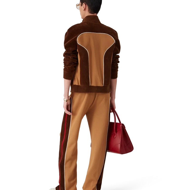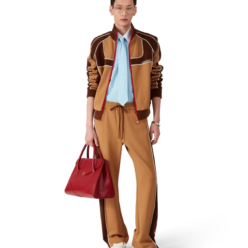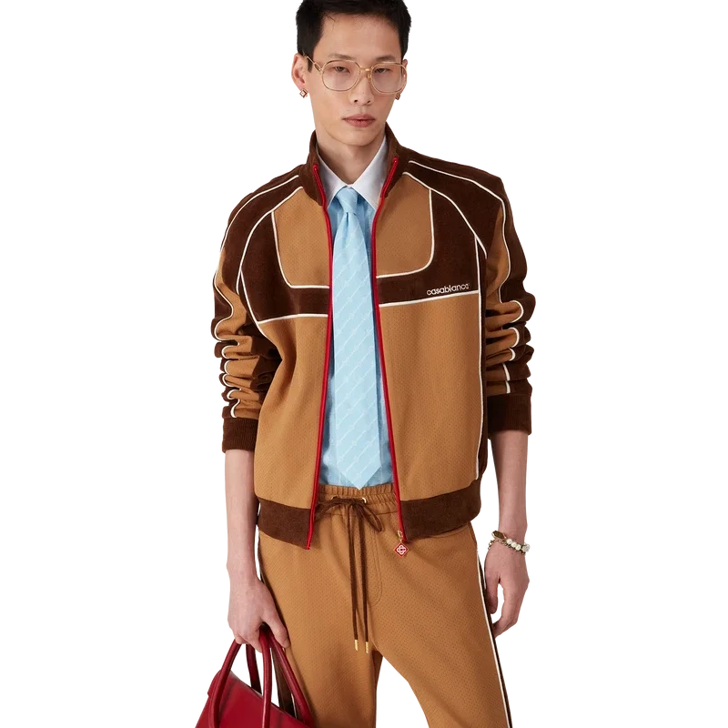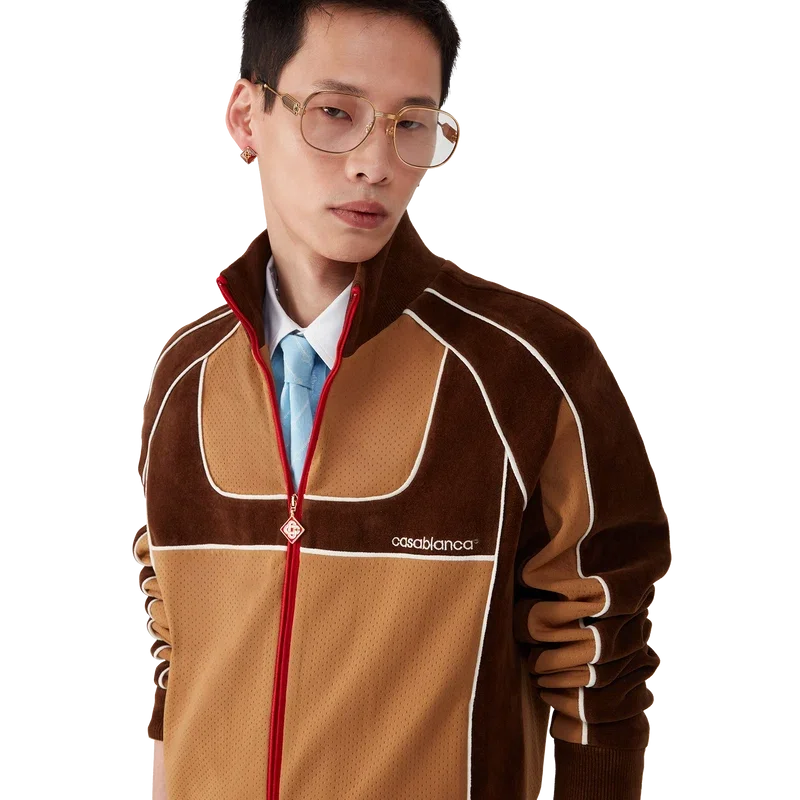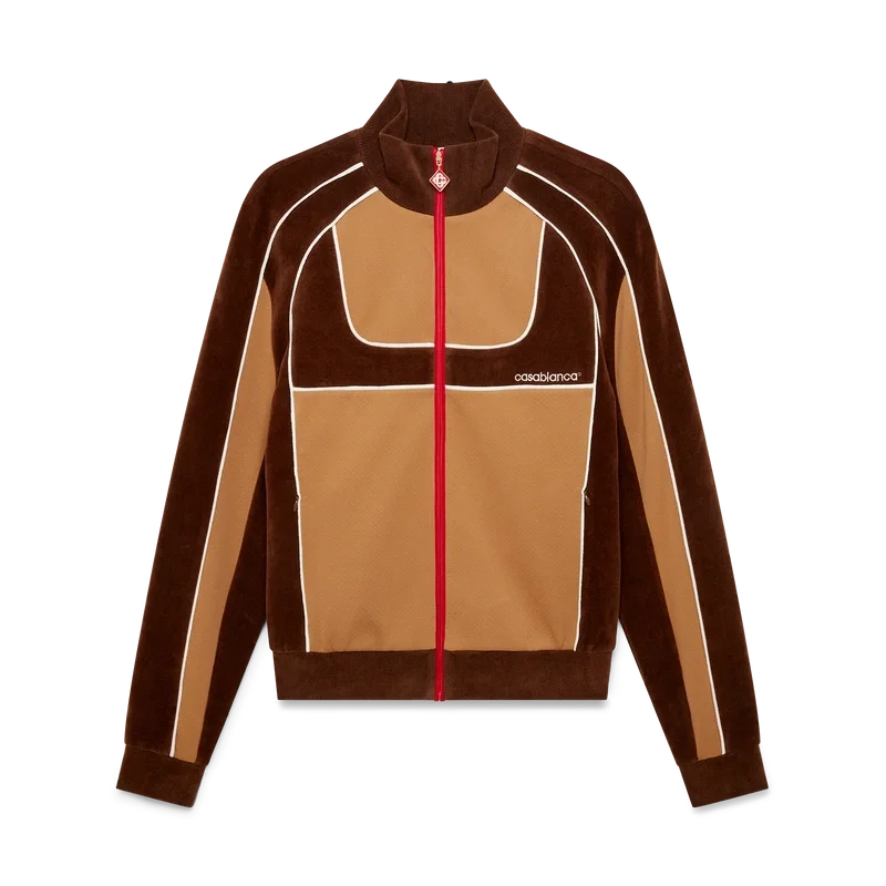 Träningsjackan med paneler i chenille är en sportinspirerad design tillverkad av tekniskt velourtyg och har husets signaturdiamantlogo på dragkedjan. Kompletterad med dragkedja, paneler med vita kantdetaljer, ribbad polokrage, muddar och nederkant. Designad för att bäras med matchande träningsbyxor med paneler i chenille.
